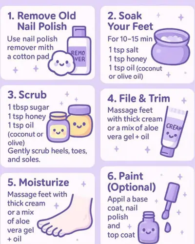This section also serves as aftercare advice for pedicure at home, helping you maintain soft, healthy feet and long-lasting results between salon visits.