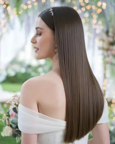 A classic option that blends sophistication and softness, this long straight hair style for wedding is perfect for brides who want lift without hiding their length.